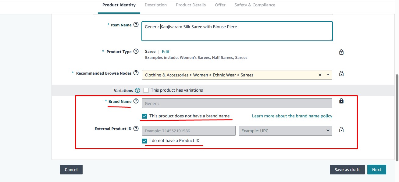 External Product ID tick - “I do not have a Product ID (GTIN).”